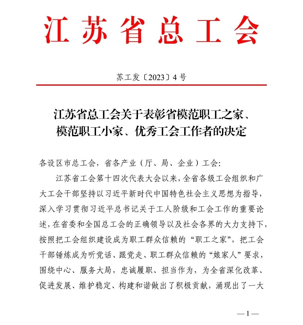 继被授予“镇江市十佳模范职工之家”荣誉后,近日,sunbet平台官网入口集团工会委员会再获省总工会表彰,被评为“江苏省模范职工之家”。