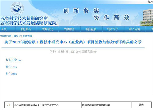 近日,江苏省科技厅发布《关于2017年度省级工程技术研究中心(企业类)项目验收与绩效考评结果的公示》,sunbet集团“江苏省电能传输母线设备工程技术研究中心”被公示为“优秀”。