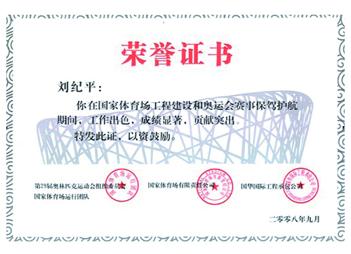 近日,从北京传来喜讯,我公司客服中心员工刘纪平,在国家体育场建设和奥运会赛事保驾护航期间,因工作出色、任劳任怨、业绩突出,荣获奥组委国家体育场运行团队、国家体育场及总包单位国华国际工程承包公司的联合表彰。这是集团众多兄弟单位在现场保驾人员中唯一获此殊荣的员工。