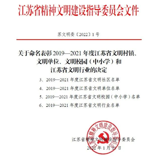 近日,江苏省精神文明建设指导委员会公布“江苏省文明单位”名单,sunbet平台官网入口顺利通过江苏省文明单位复评,连续6年蝉联“江苏省文明单位”荣誉称号。